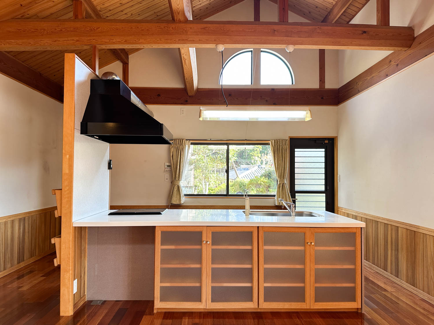 キッチンの照明と飾り窓がどちらもかまぼこの形で揃っているのも、なんだかいい感じ。お日様が眩しい時は、ロールスクリーンを閉めることで快適にお過ごしいただけそうです。