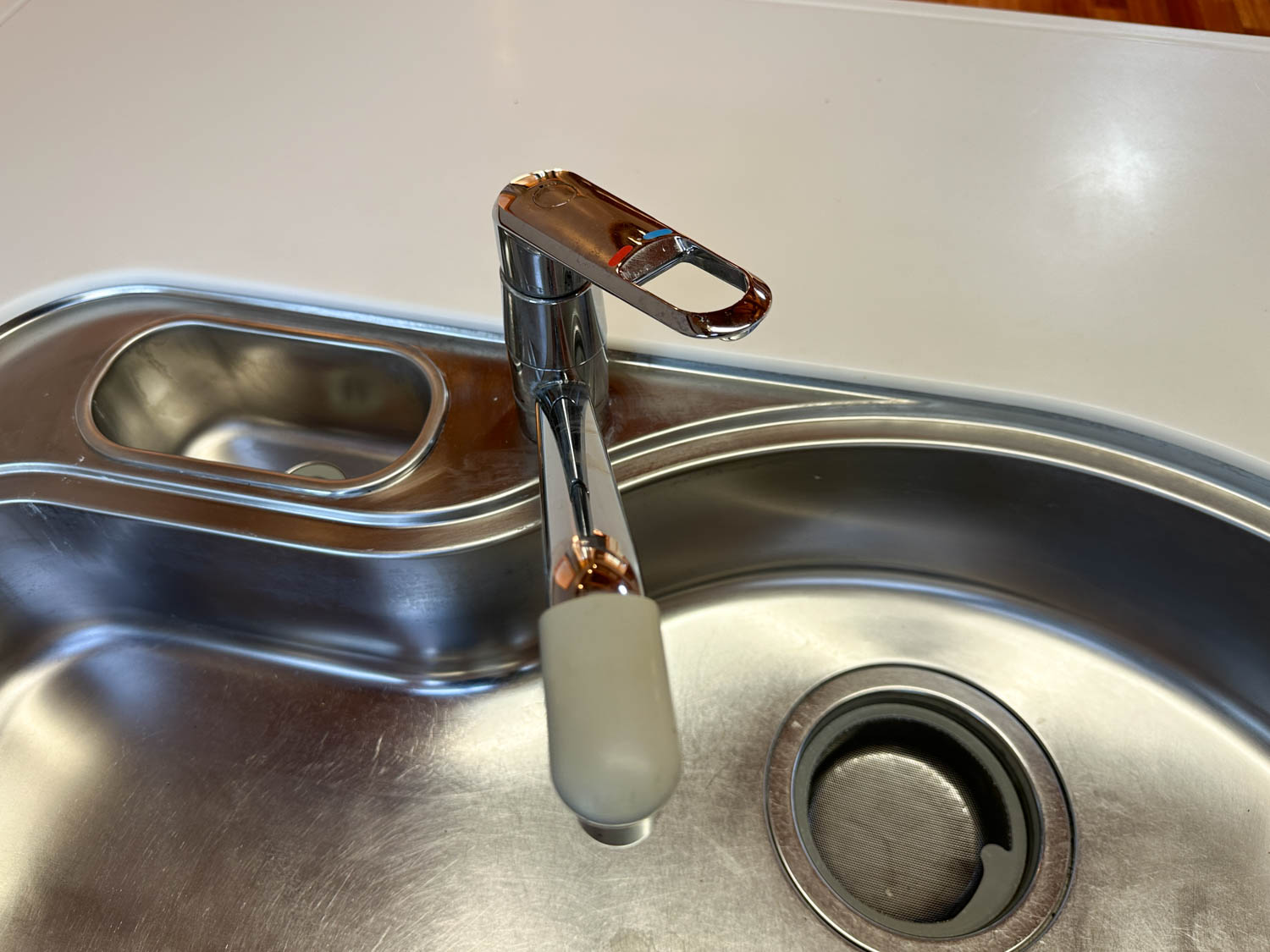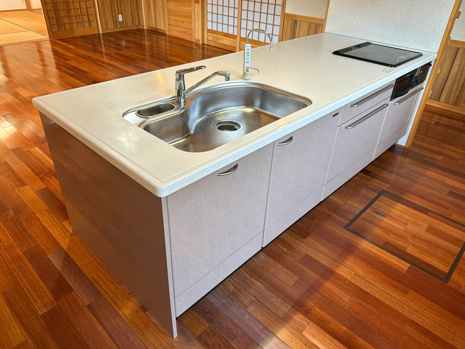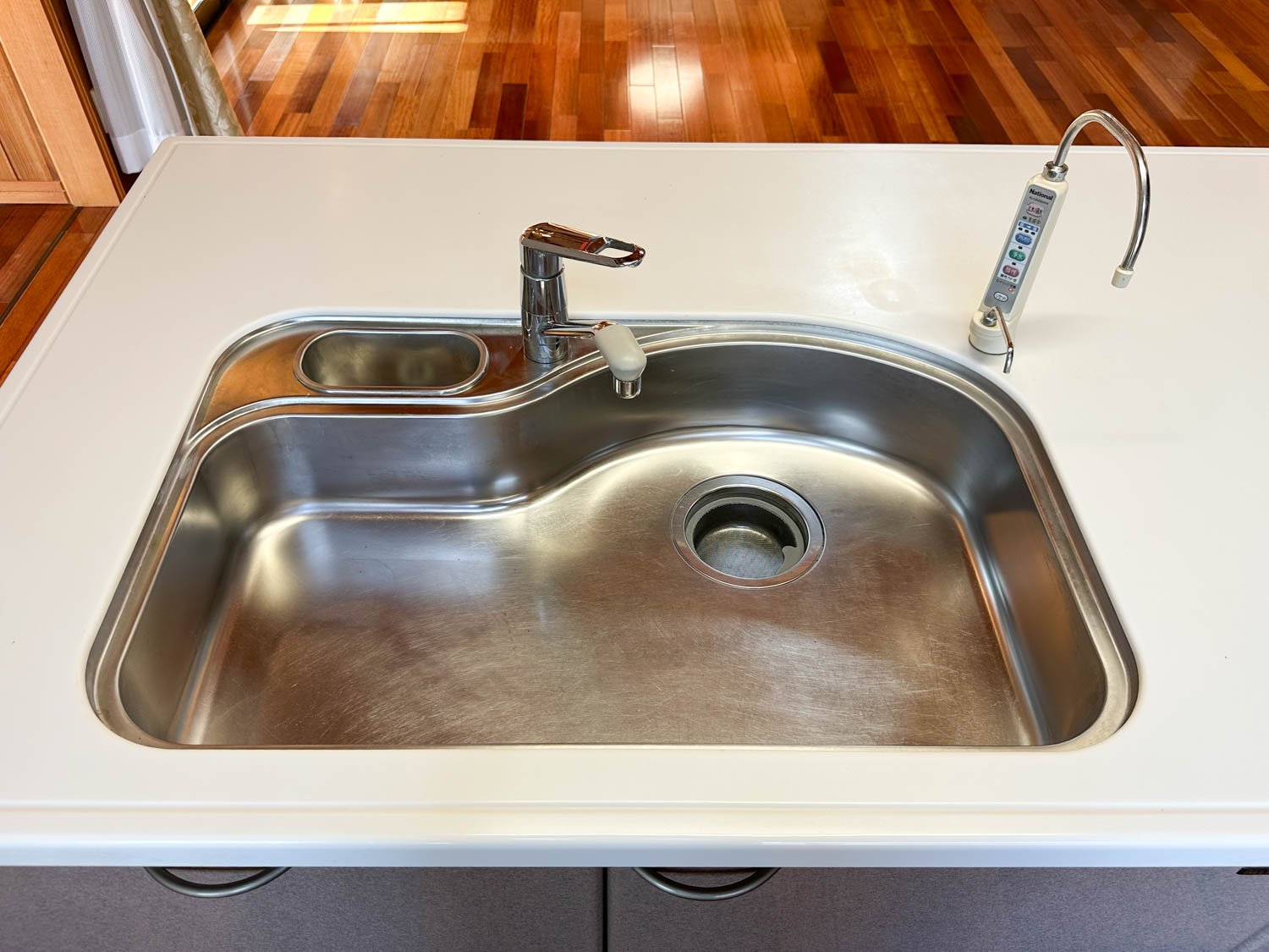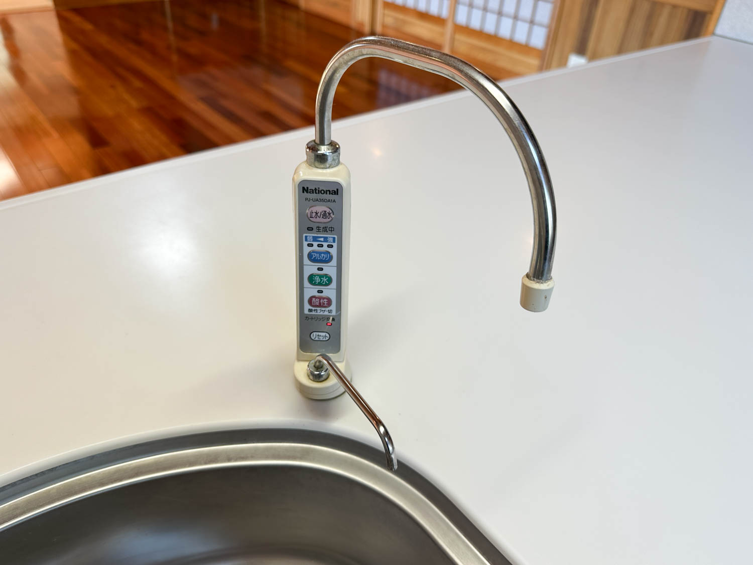 流し台には、混合水栓とナショナル製のアルカリ整水器がついていました。カートリッジ交換サインが点灯していたので、お取り替えをオススメします。(動作未確認)