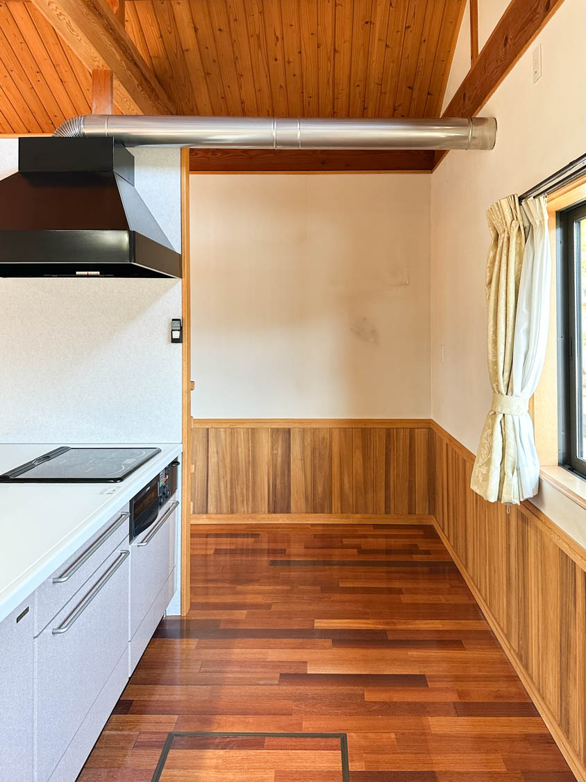 キッチンから壁まで150cmほどあるので、レンジ台などを置いてもゆったりとご使用いただけそう。換気扇のダクトは、キッチン裏の外壁へ抜かれていました。