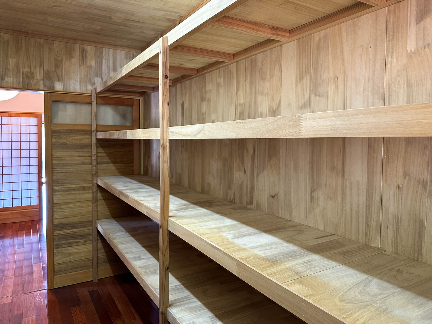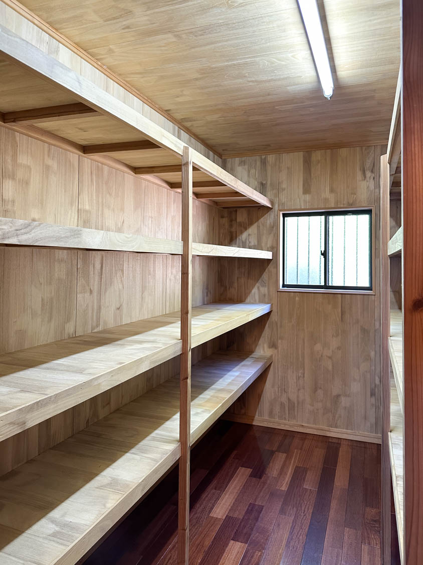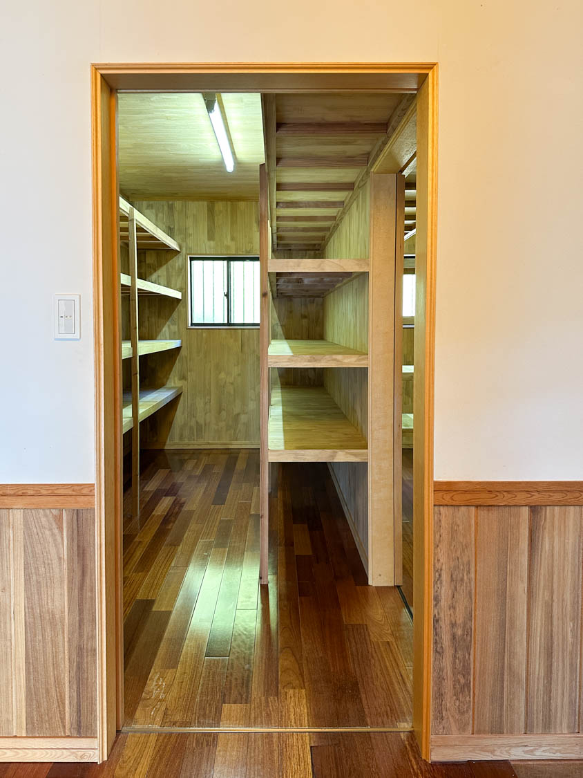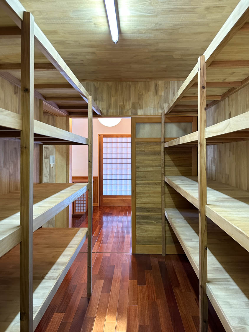 納戸の両側には50cmほどの奥行きの棚が、ずらりと設置されていました。