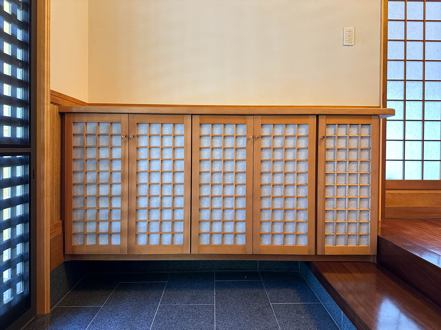 こちらの下駄箱も手作りとのこと。職人さんたちの熟練の技が光ります。