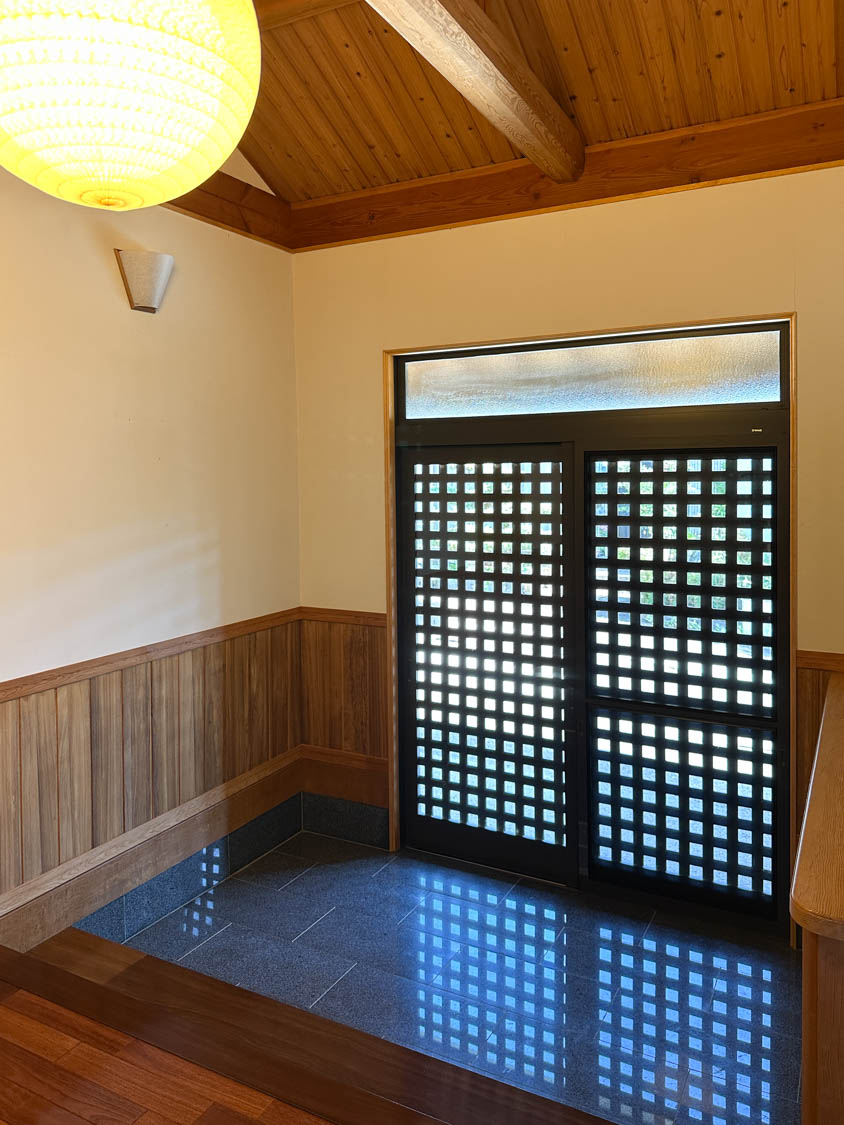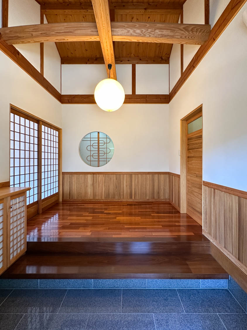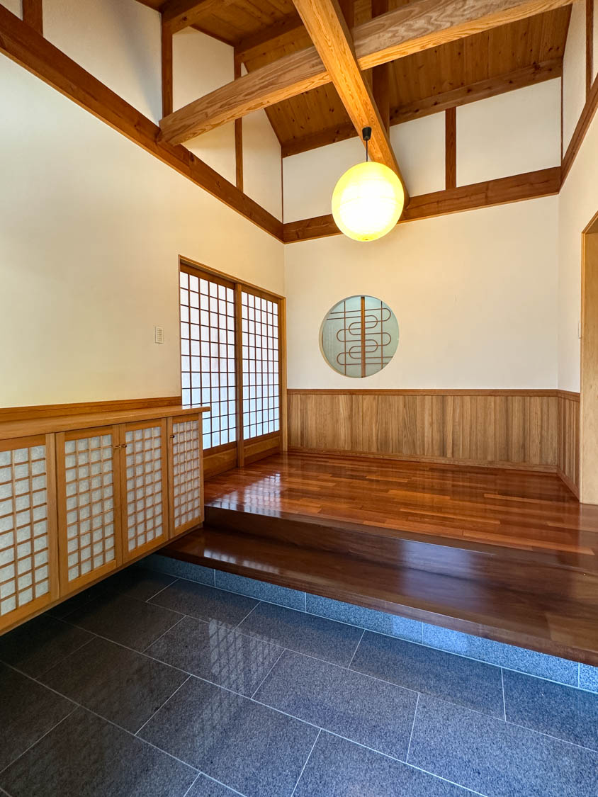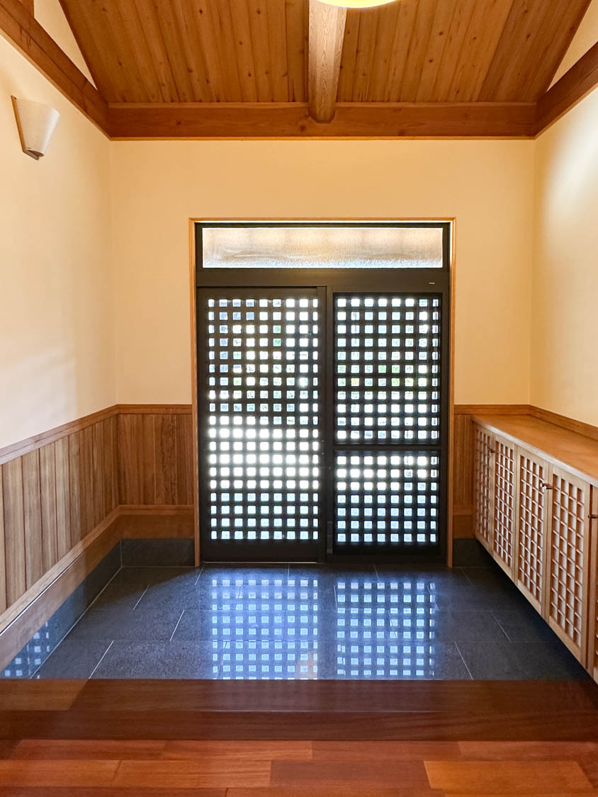 入った瞬間に思わず息を呑む圧巻のエントランス。迫力のある化粧梁が、まるで旅館に来たかのような気持ちにさせます。(※写真は広角撮影のため、空間が実際より広めに感じられることがあります。)