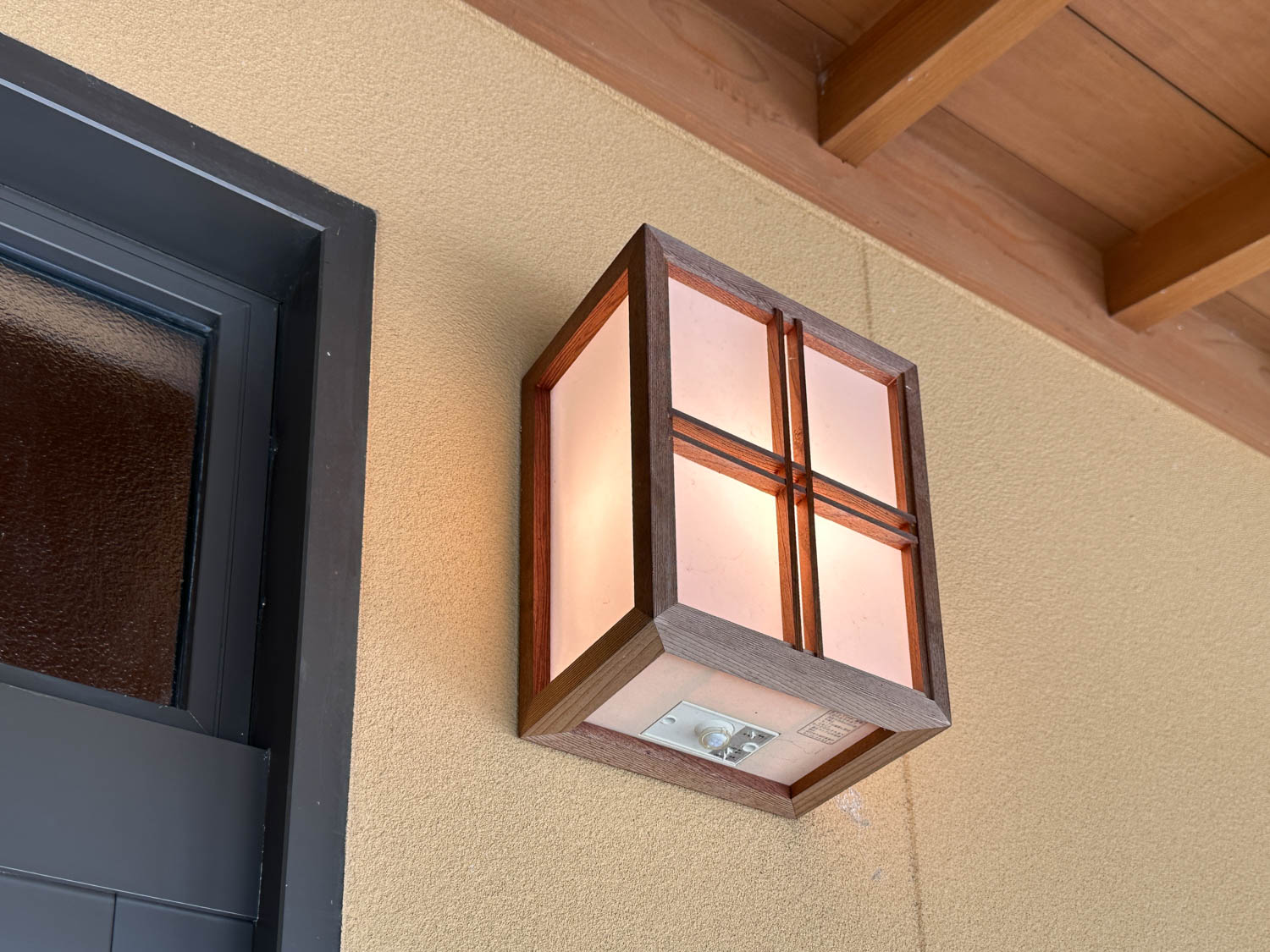 雰囲気のある玄関照明。インターホンや壁付けのポストも設置されています。