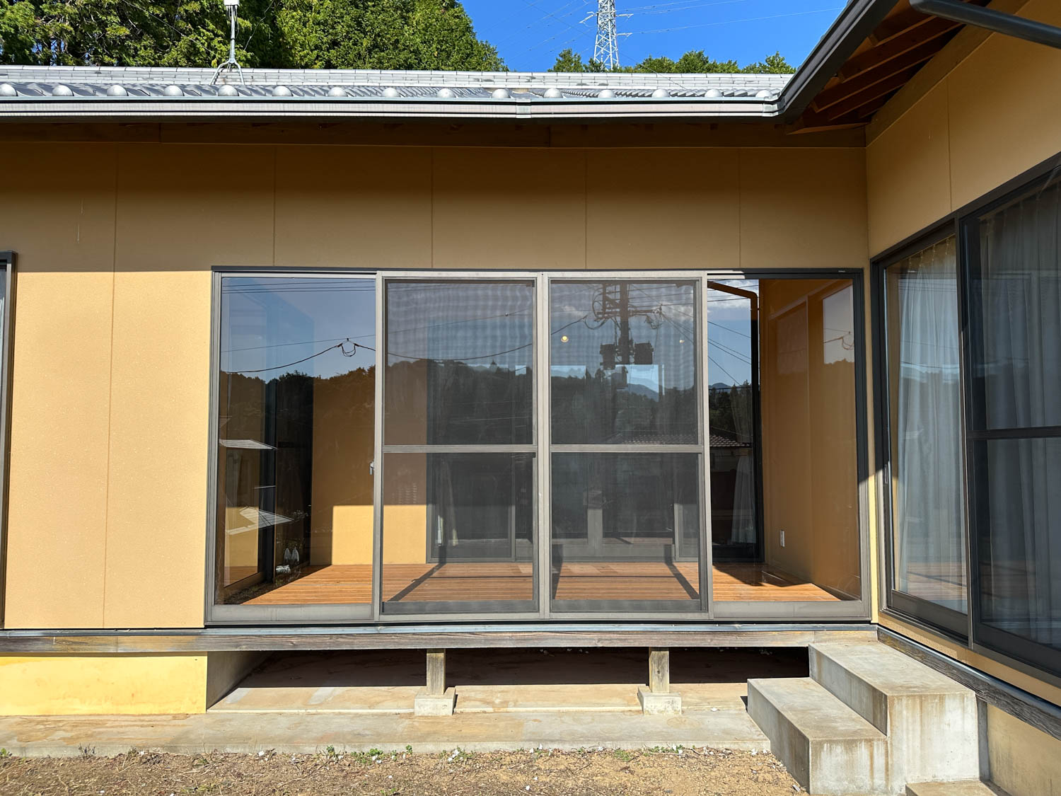 サンルームから見た外周りの様子。高台に建っているので、遠くの山まで見渡せます。