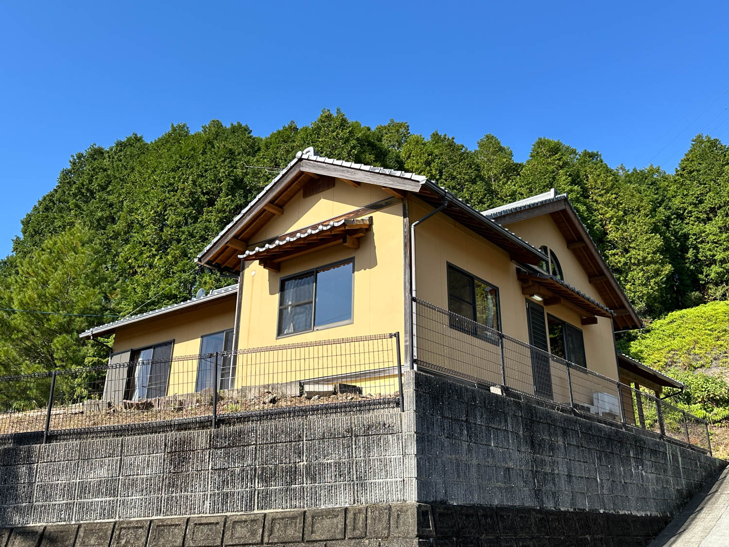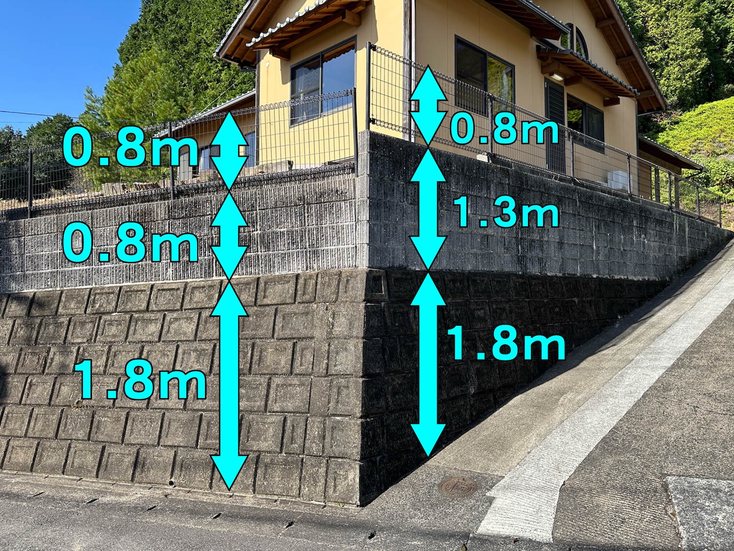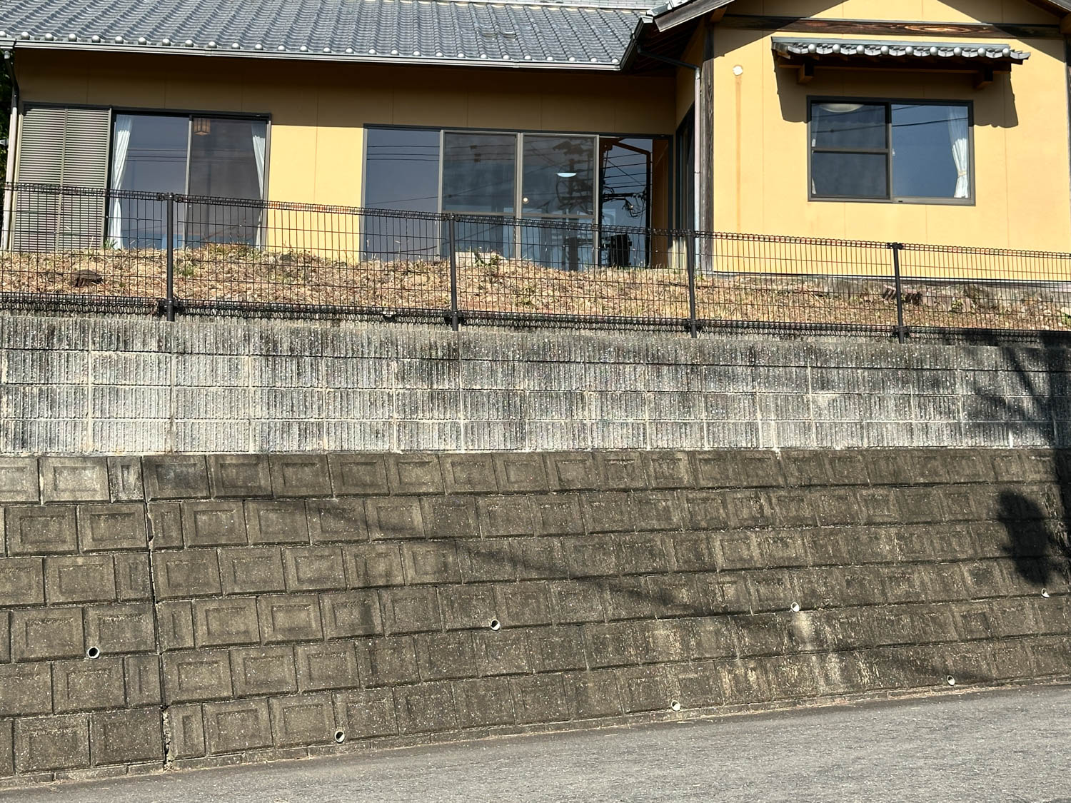 間知ブロックと化粧ブロックの土留めの上には、0.8mのメッシュフェンスが設置されています。