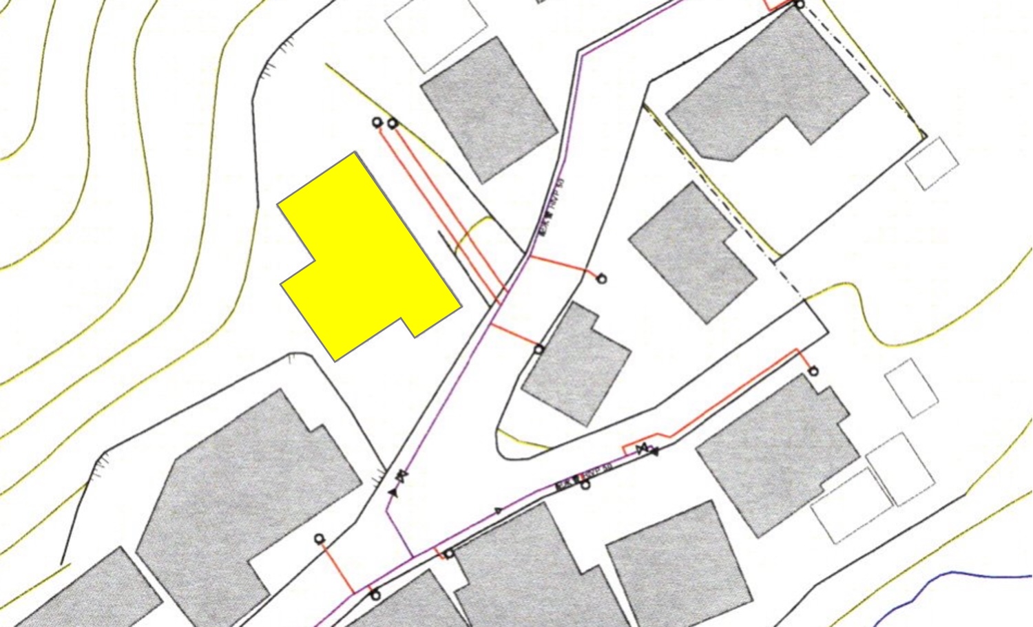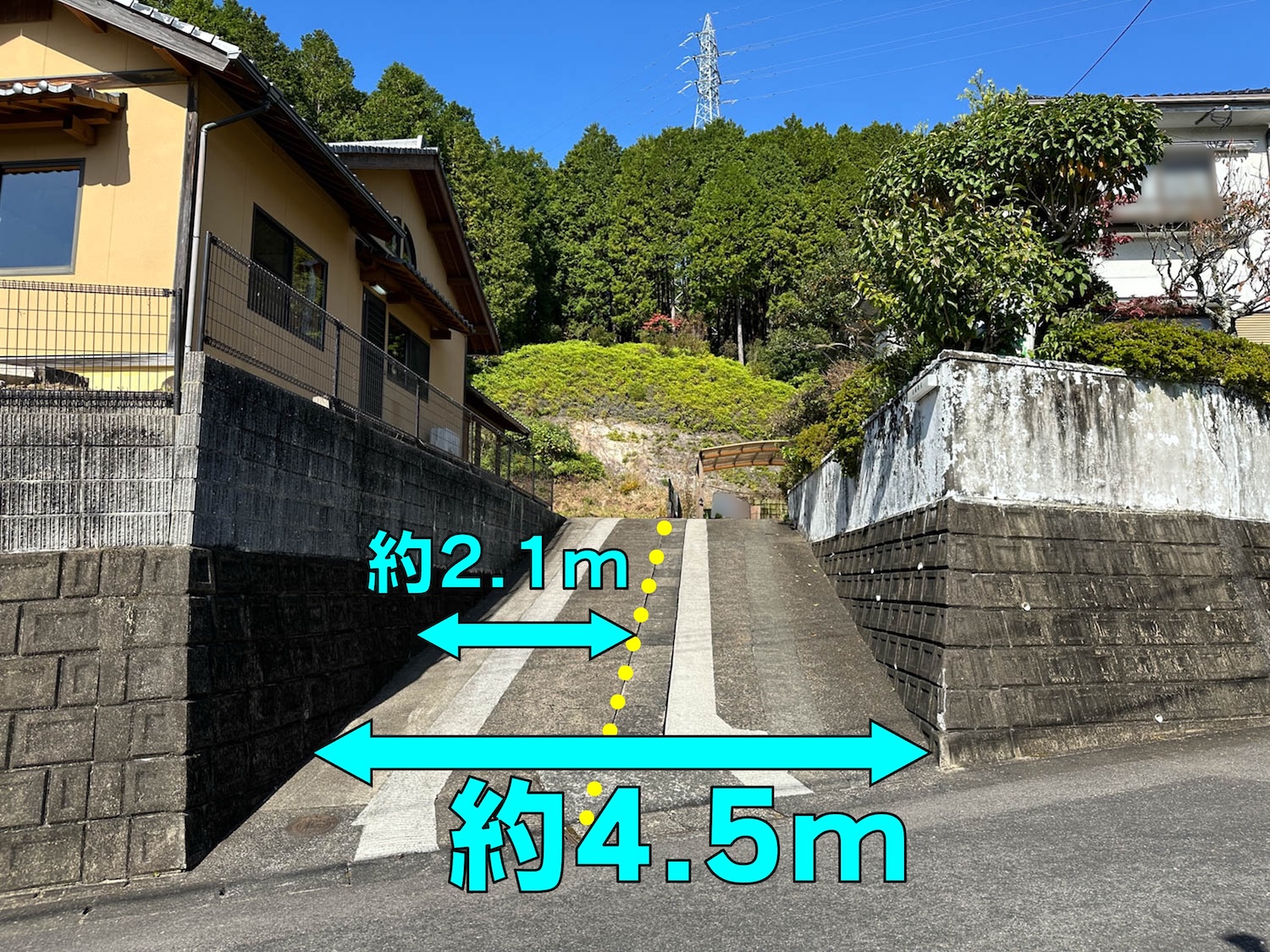 建物まではこちらのスロープを登って行きます。黄色の点線までが今回の敷地ですが、現在はお隣の方と譲り合って出入りされているようです。