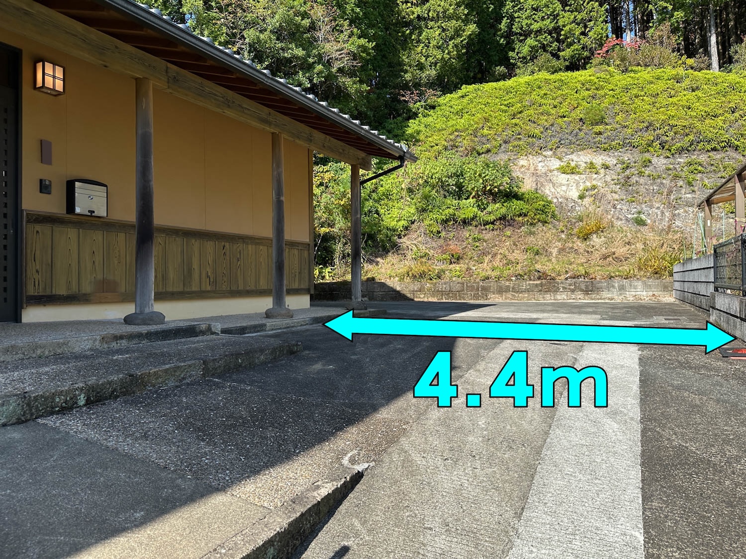 敷地の奥には駐車場があり、そこまでの通路幅は4.4mほどでした。