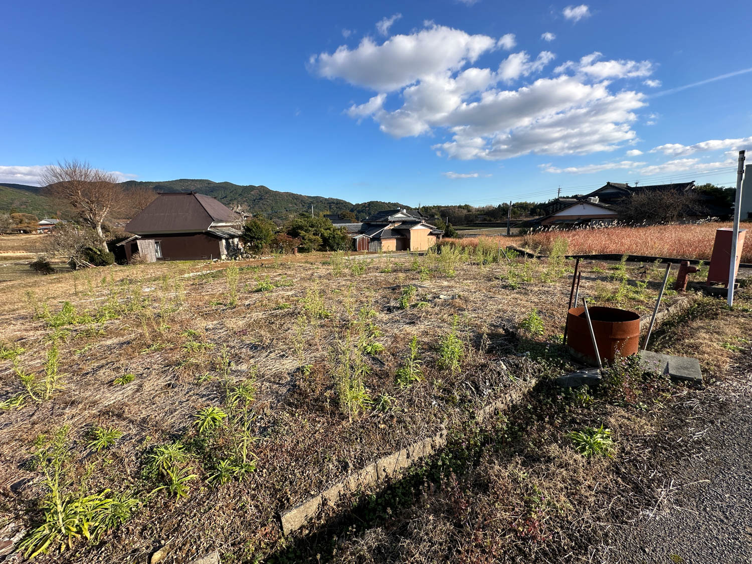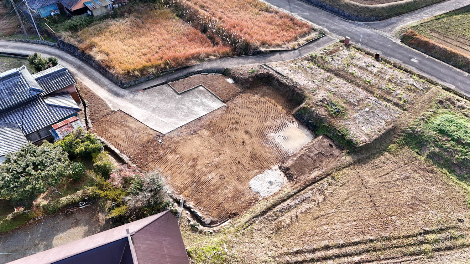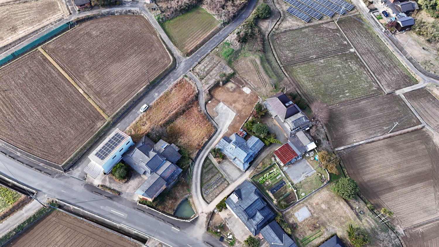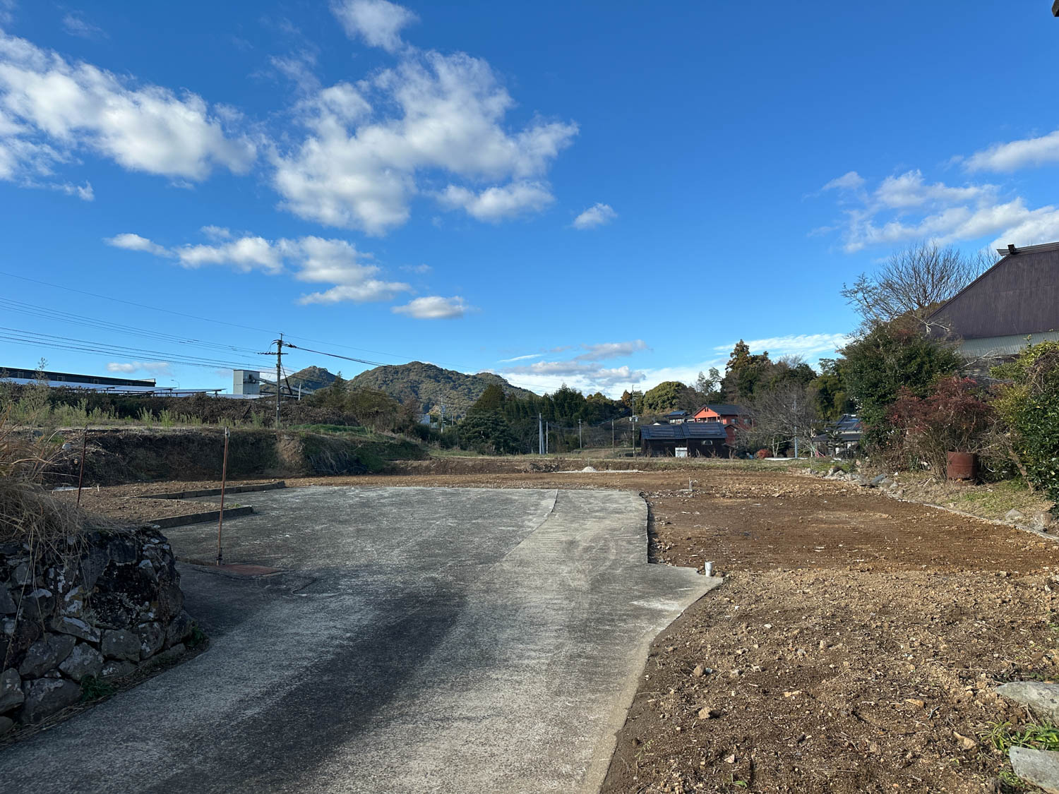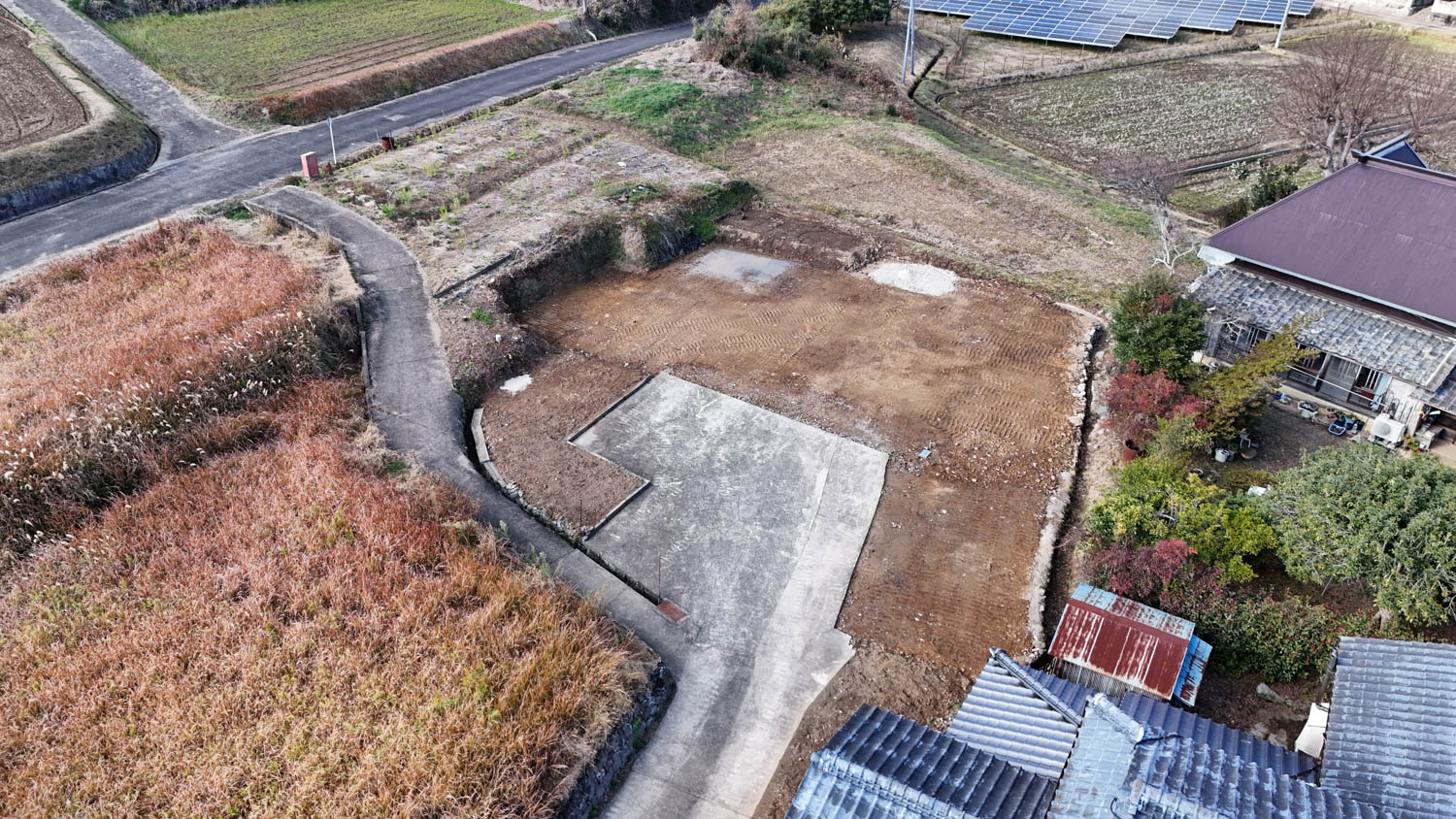 中央に伸びる道の先にある空き地が、今回ご紹介する物件です。付近には家が数軒建っていますが、密集しておらず程よい距離感なので、落ち着いた環境でお過ごしいただけます。