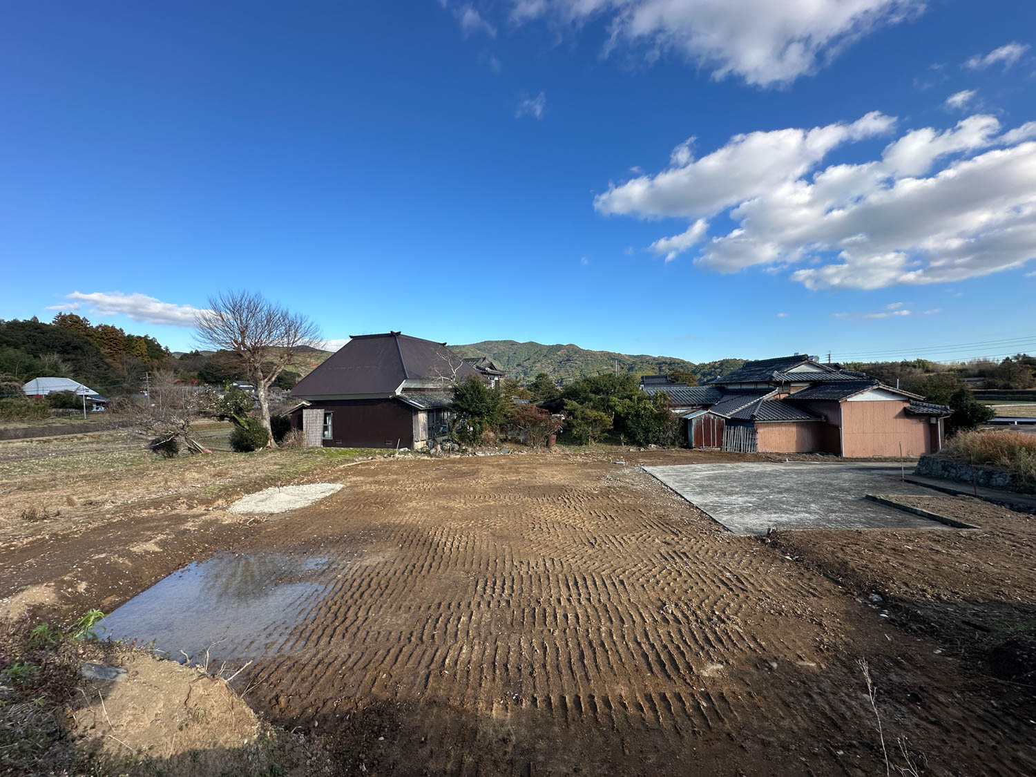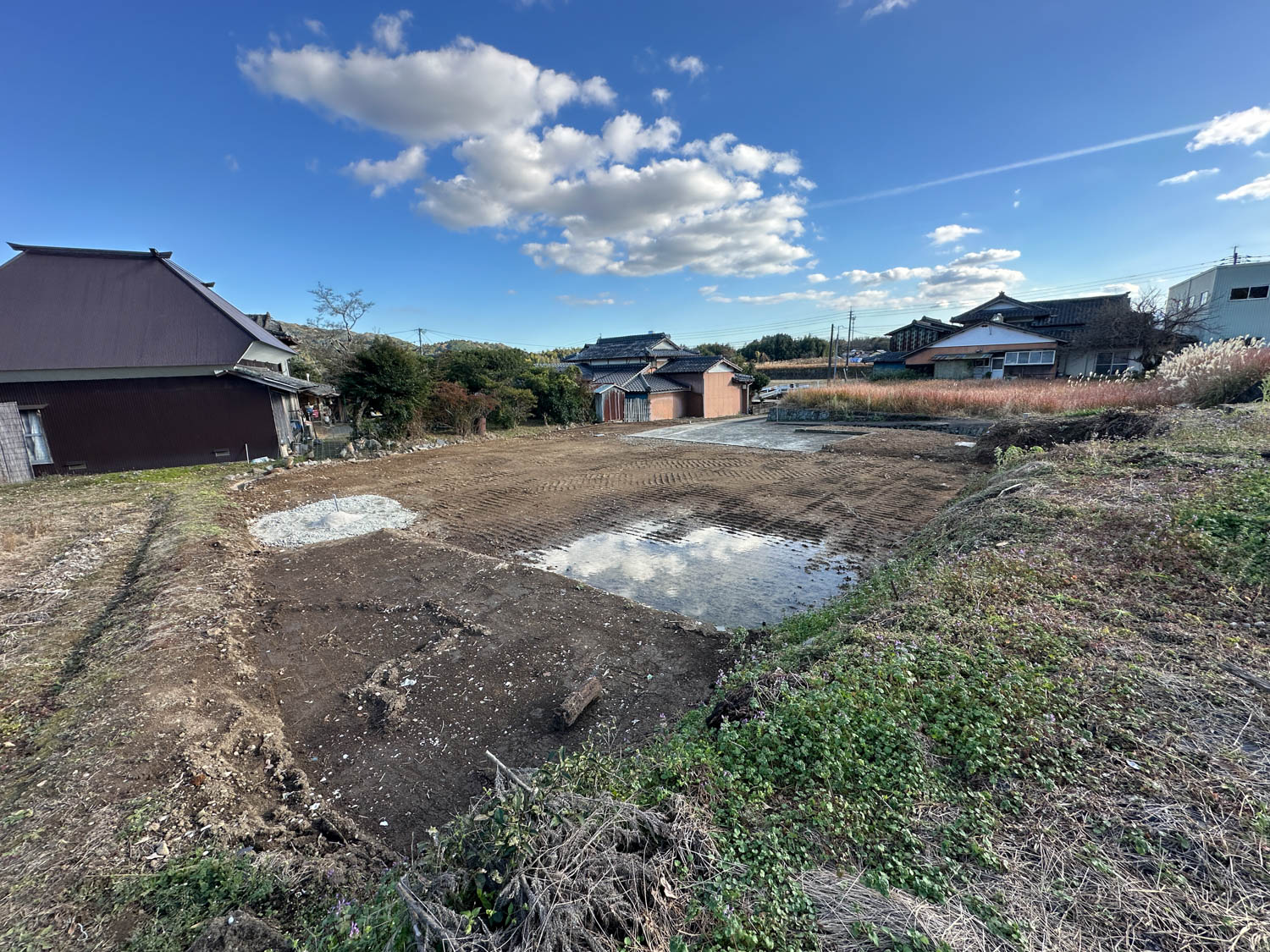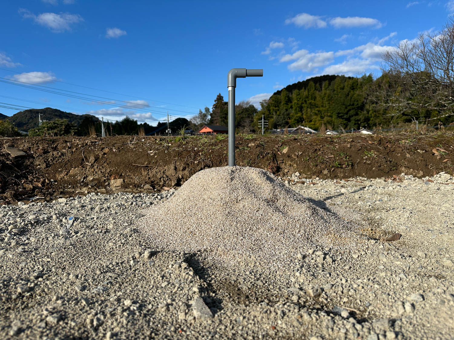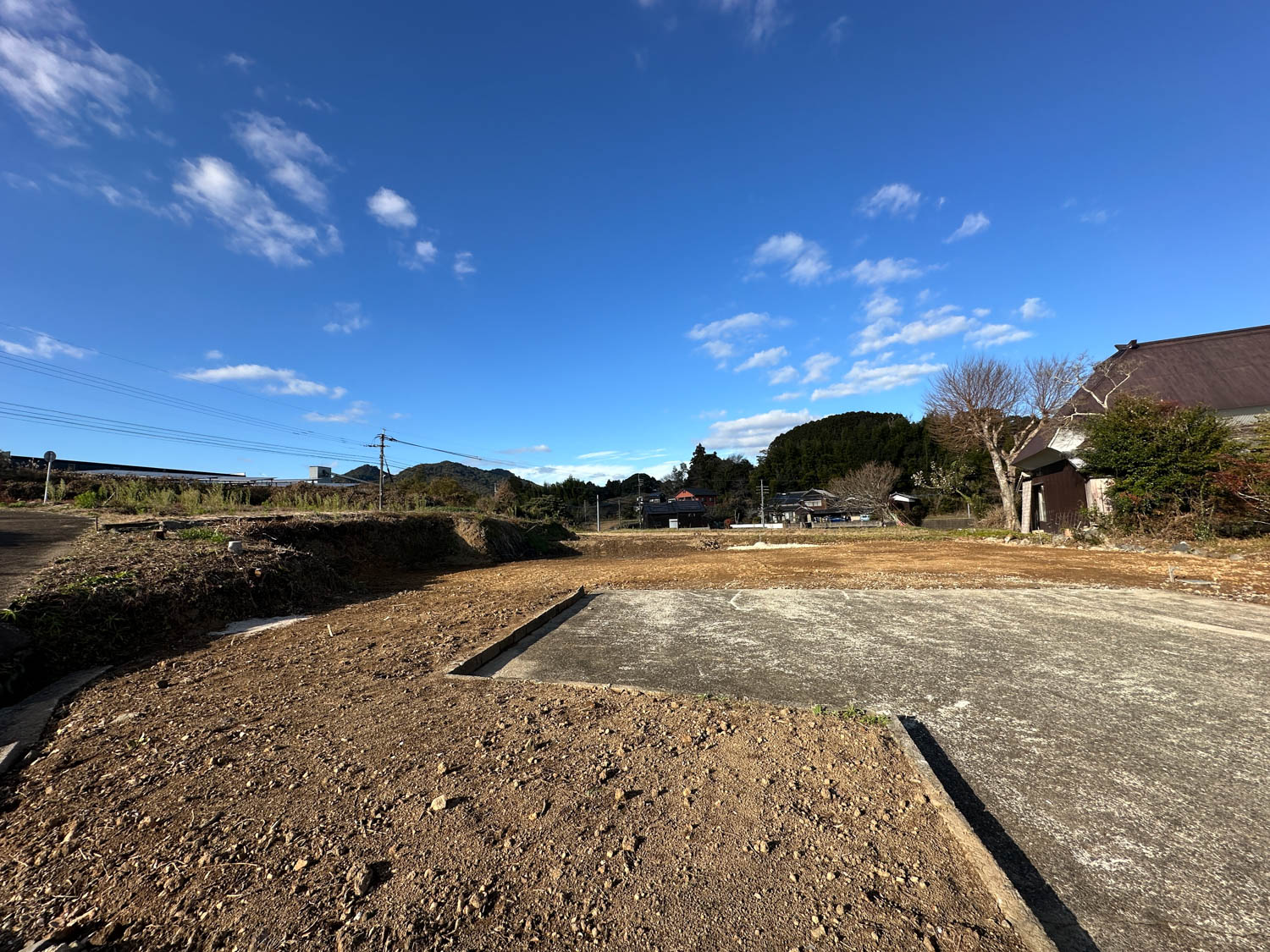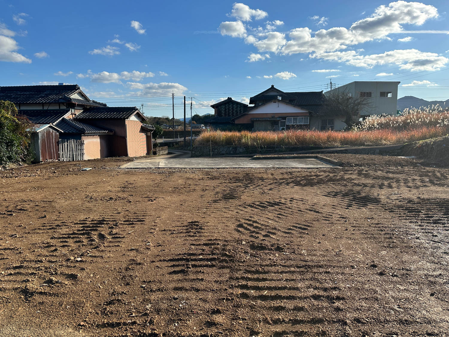 中央に伸びる道の先にある空き地が、今回ご紹介する物件です。付近には家が数軒建っていますが、密集しておらず程よい距離感なので、落ち着いた環境でお過ごしいただけます。