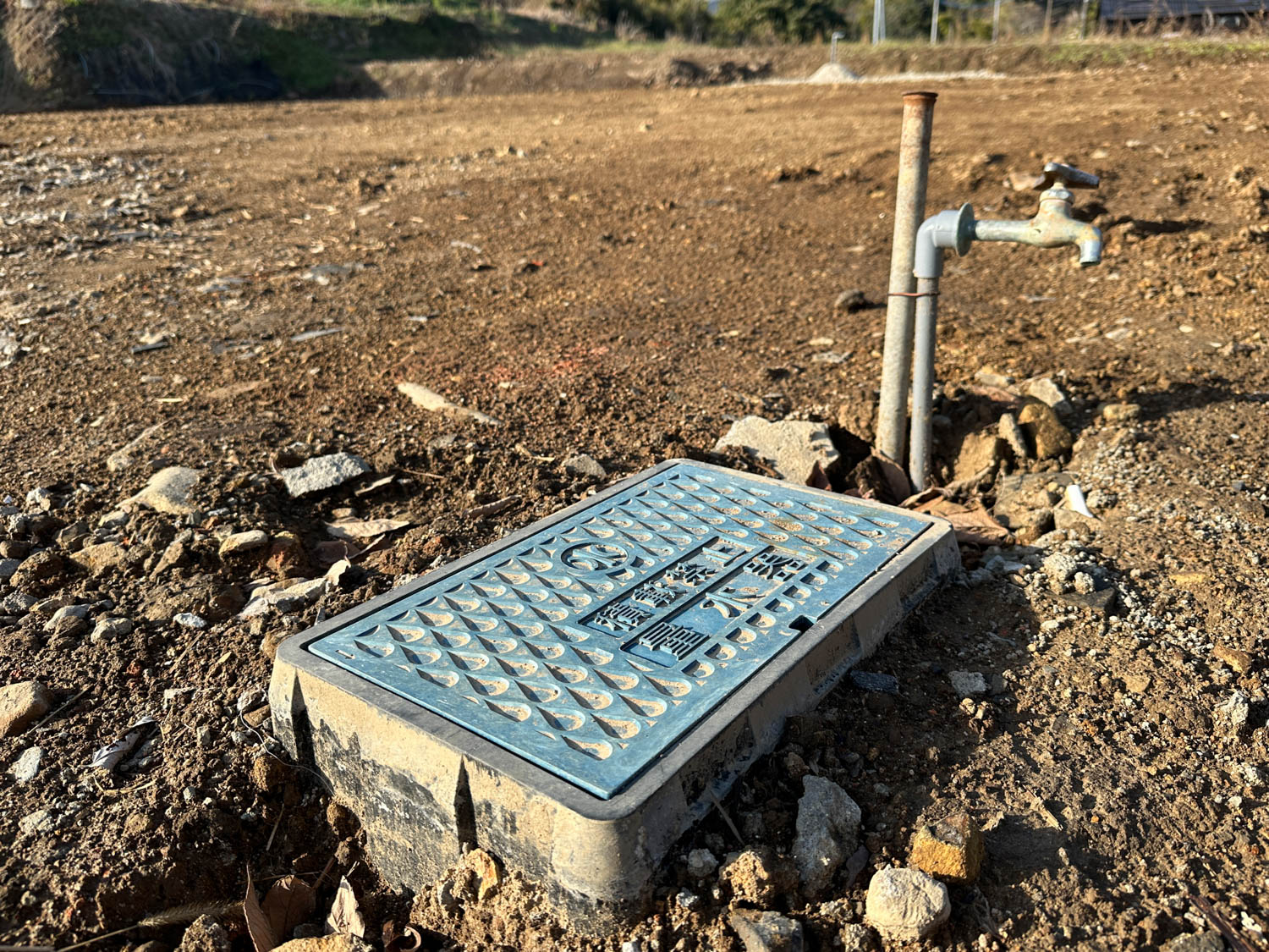 写真左は水道のメーターボックスです。写真右は、以前井戸があった場所。現在は埋め戻しがされているので、井戸自体はご使用いただけません。
