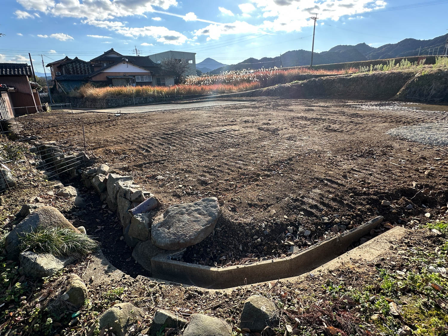 北側付近から見た様子。こちらは境界付近の様子になります。一部、U字溝が設置されてありました。