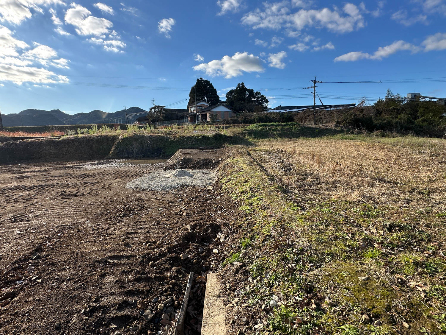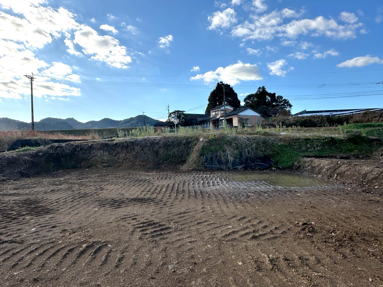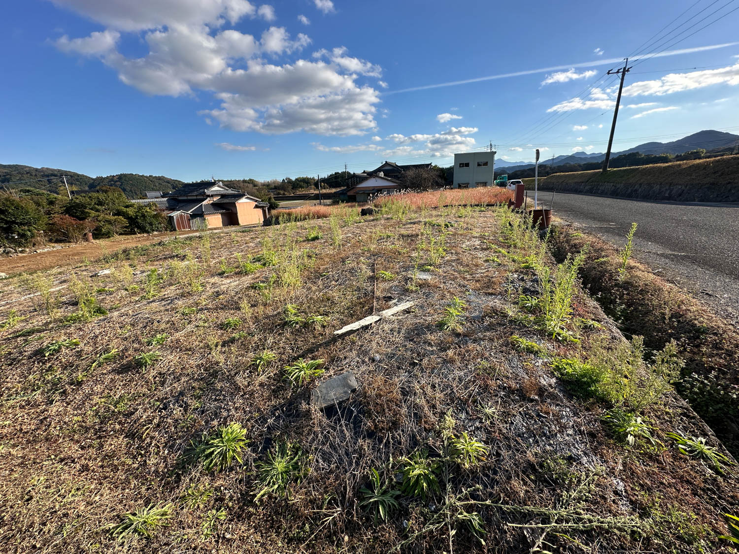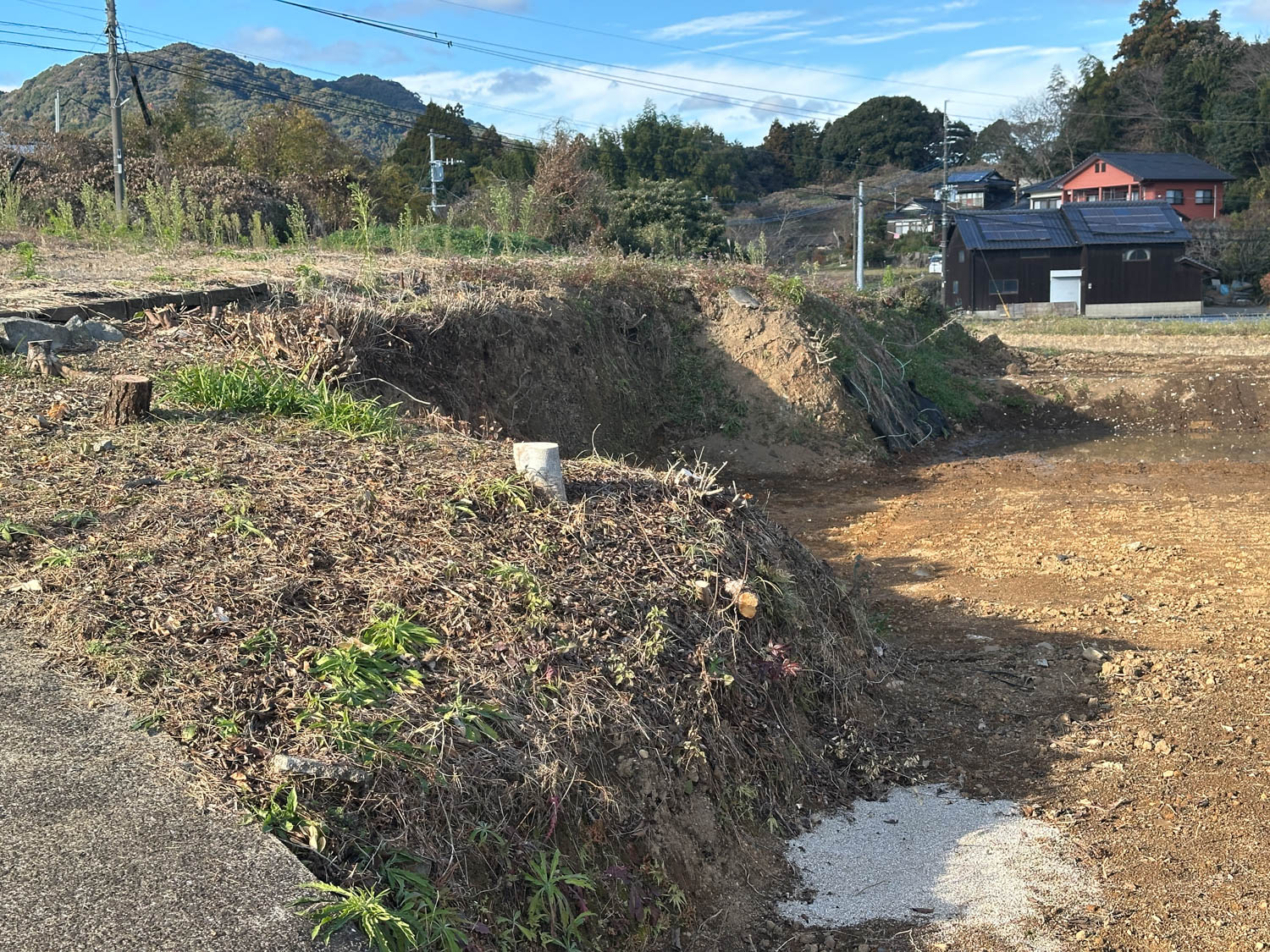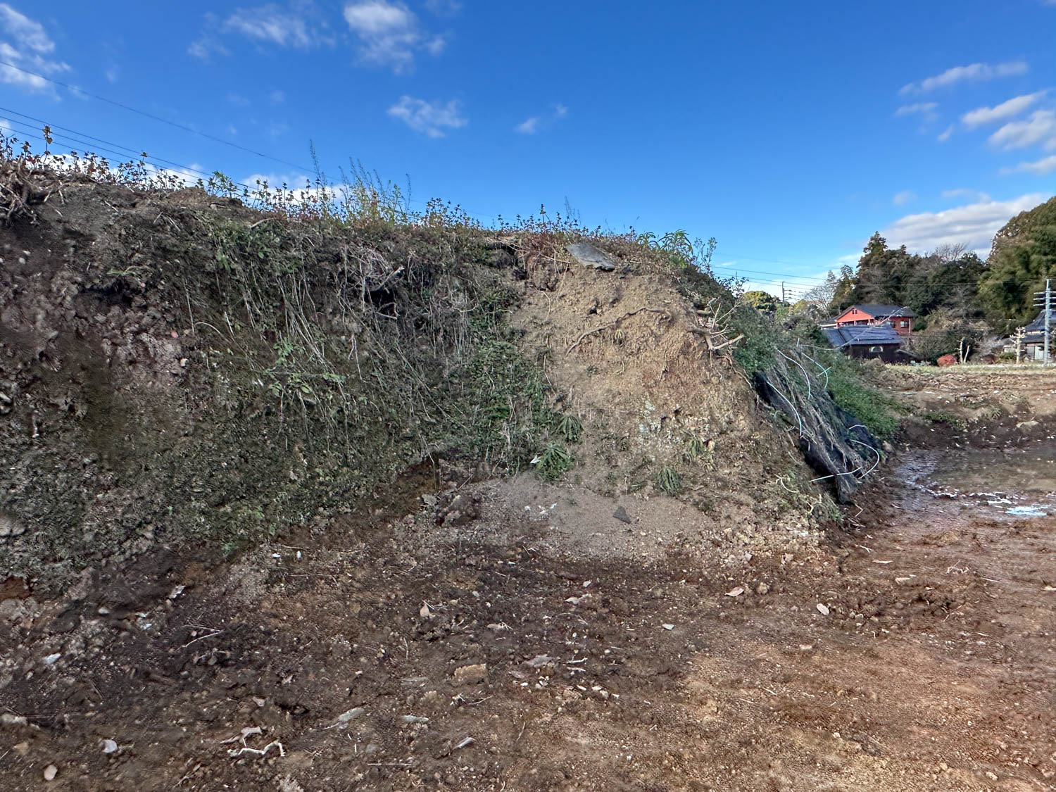 西側の農地との間には1.8mほどの段差があります。擁壁などは施されておらず、土羽の状態です。