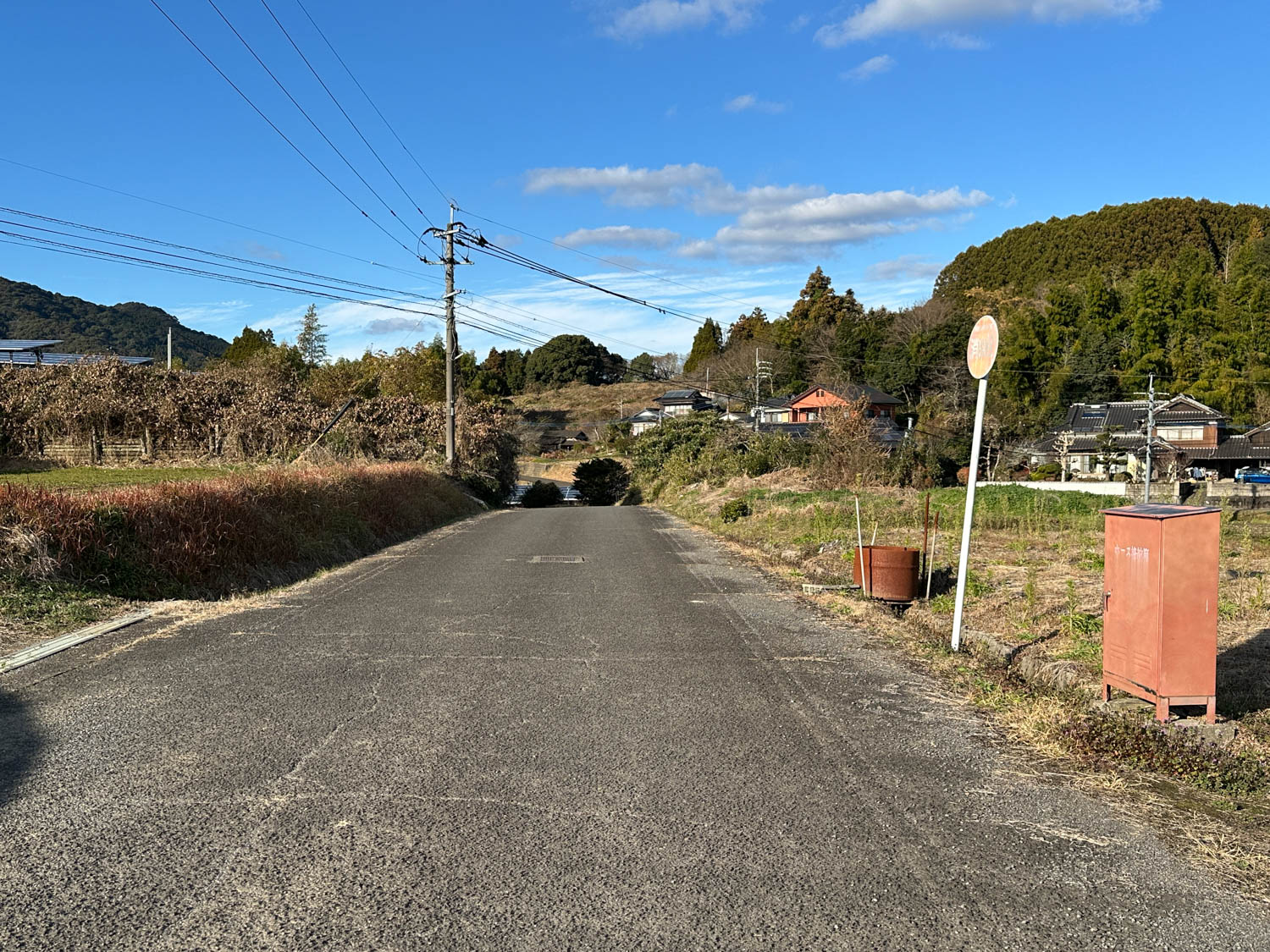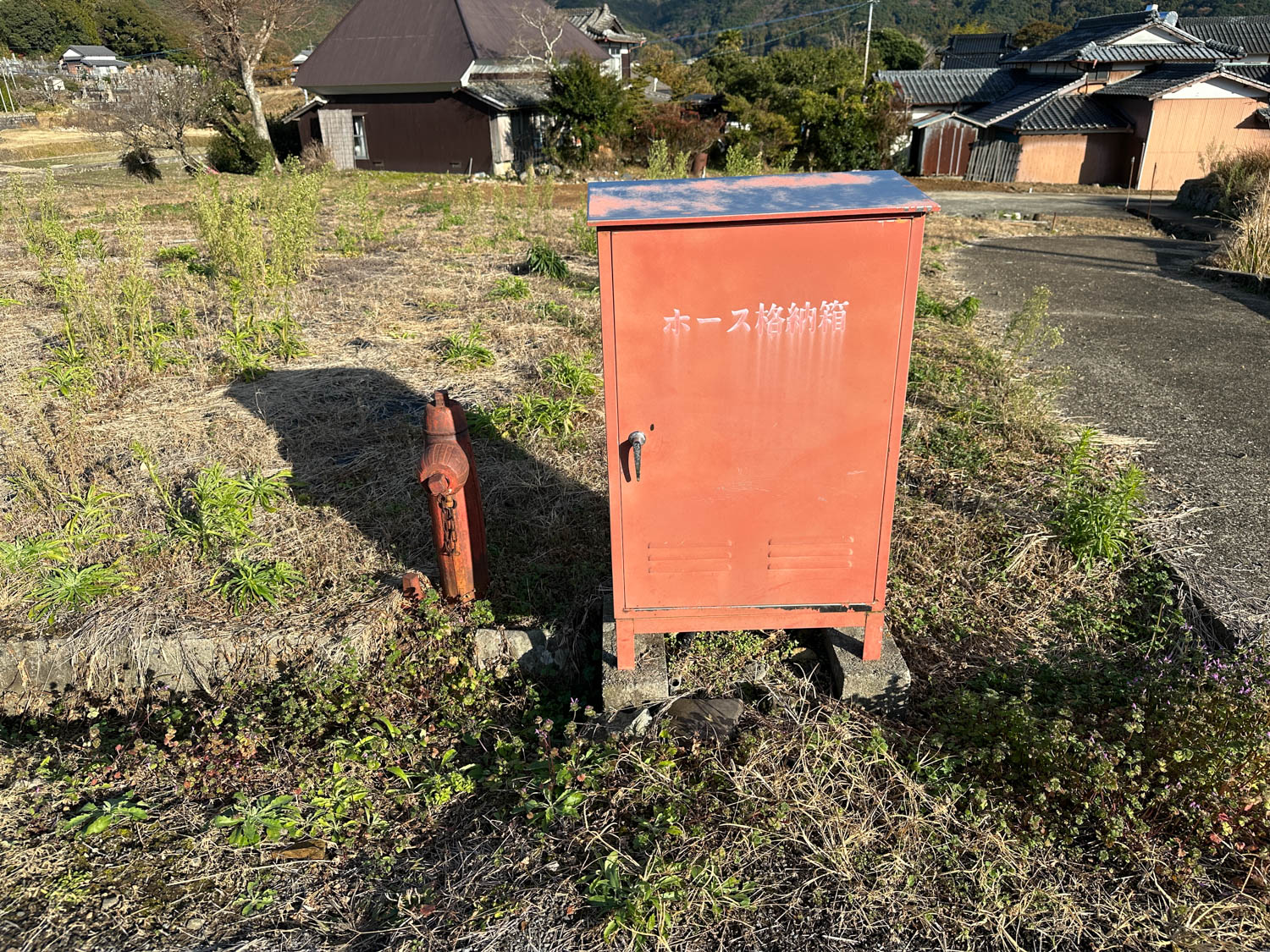 農地のすぐ前には、消火栓と消防ホースの格納箱が設置されています。