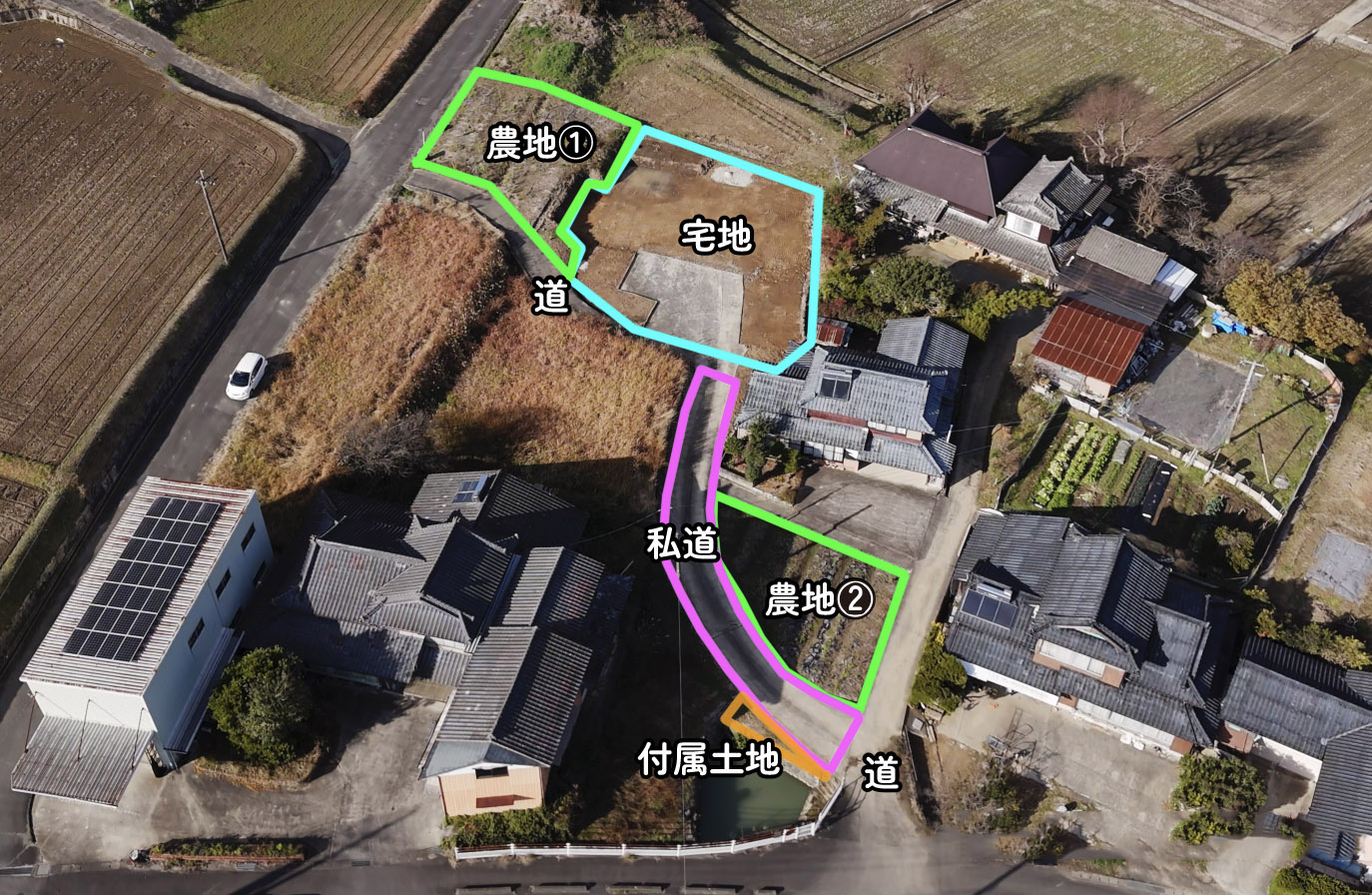 - ●その他、付属農地3筆、雑種地1筆(通路) あり。(土地権利:全て所有権/地目:全て畑/地積:合計約371.81㎡、雑種地:98㎡)●農地を取得する場合は農地法の許可を受けることが必要になります。●下水道未整備区域