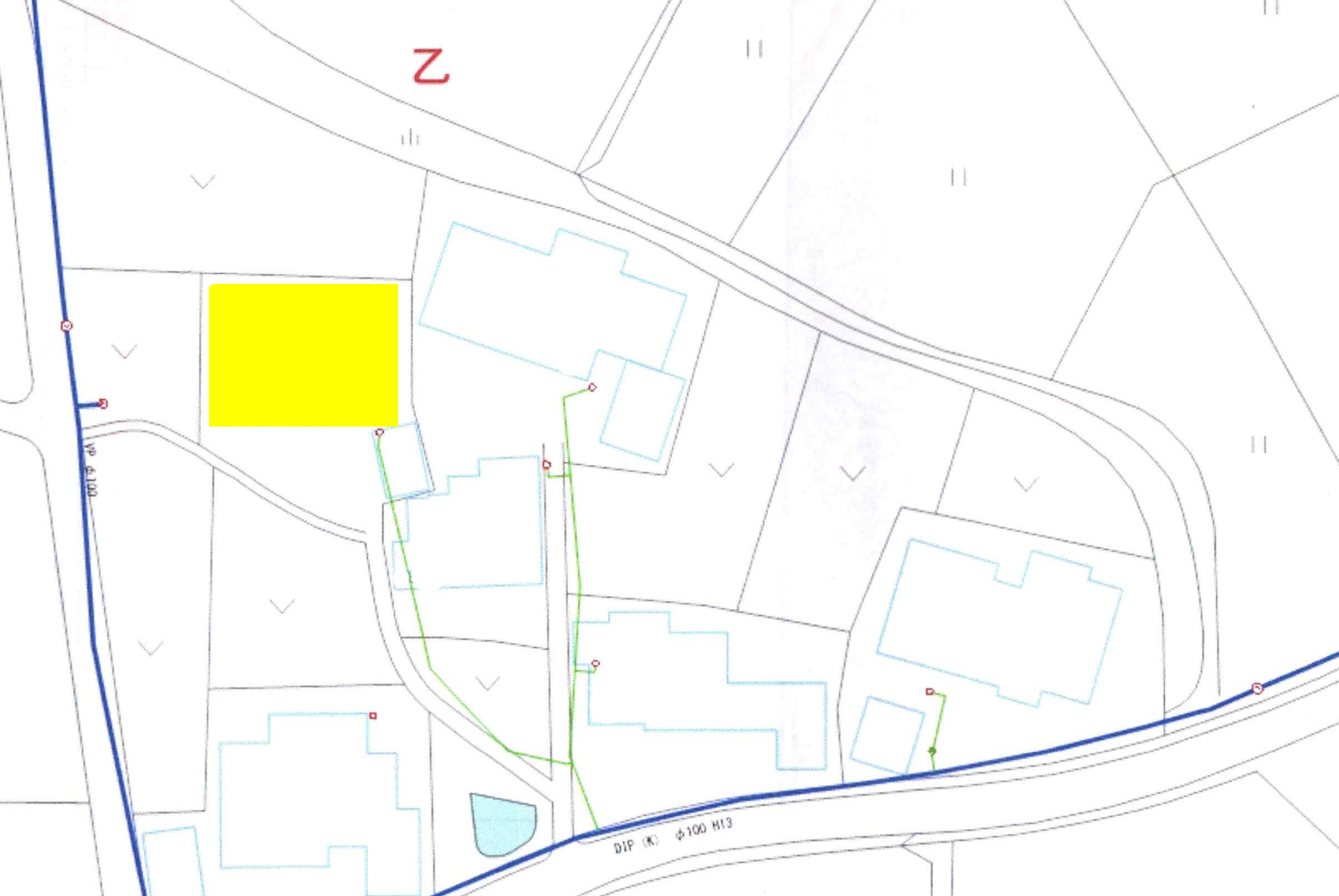 上水道は先ほどの前面道路から私道を通って配管されています。(図面上のラインは若干のズレがあります)